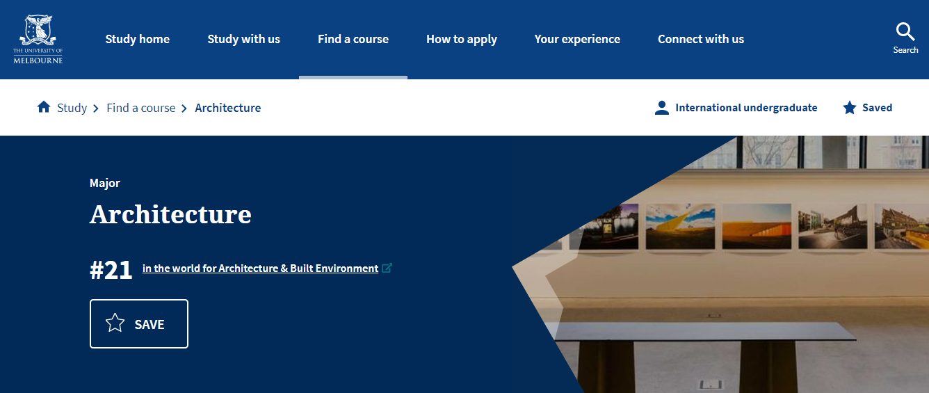 墨尔本大学的建筑专业全球著名,建筑是学科的产物,这反映在墨尔本设计学院 ﹙ms﹚ 选择的多样性。城市设计、规划、成本管理、工程、环境设计、材料科学、产品开发、建筑、景观、艺术和社会科学领域重叠在一起,告诉我们作为建筑师应该做什么。建筑师将创造性的视野、创新、技术理解和建筑理论结合起来,塑造我们在建筑环境中生活、工作和娱乐的方式。作为一名建筑师,同学们将直接应对我们世界面临的复杂挑战,并将站在变革和可持续发展及资源稀缺问题的前沿。设计是建筑过程的核心,同学们将学习如何使用建模和渲染技术通过基于工作室的类和虚拟和物理建模来开发设计。