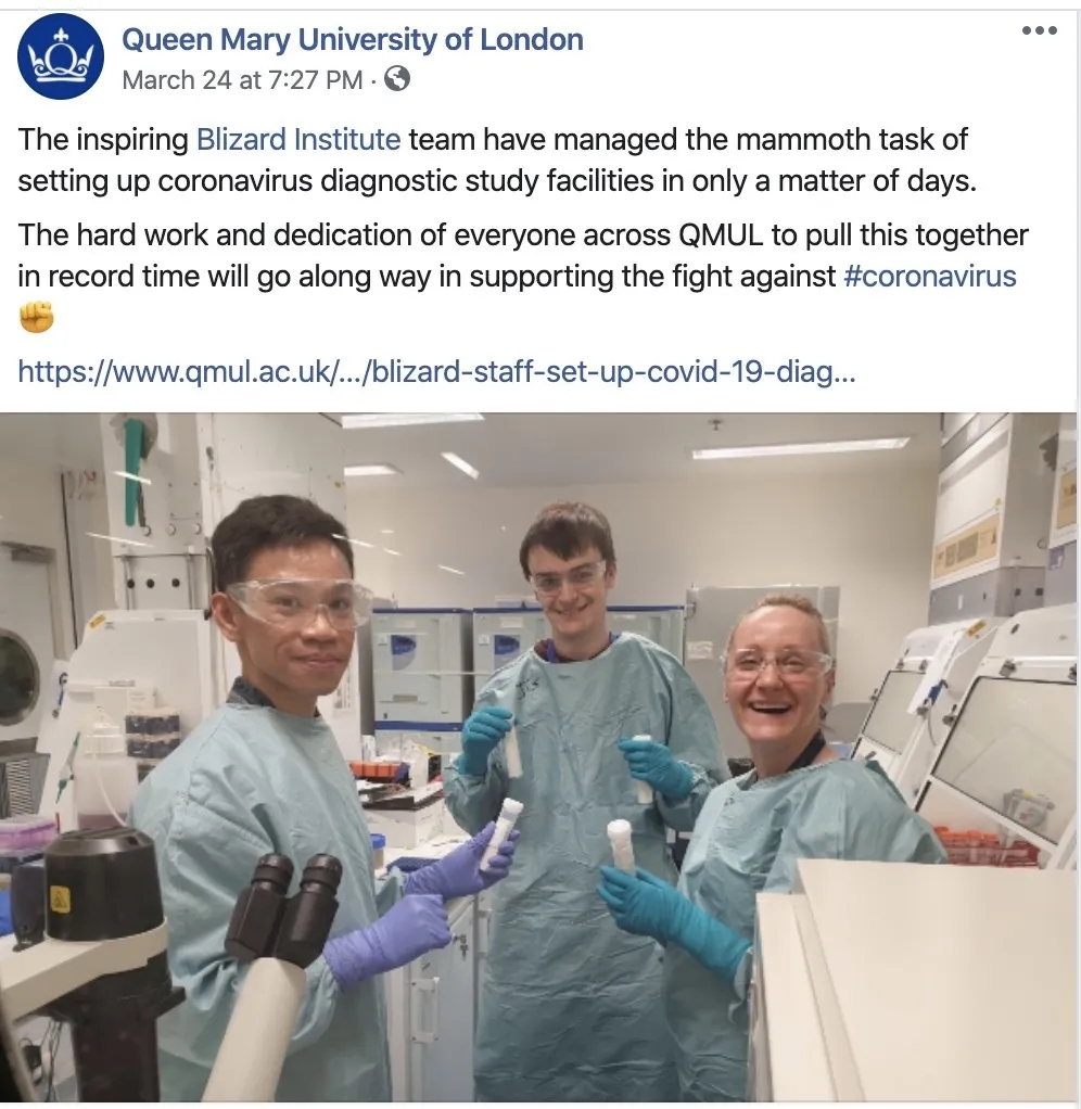 伦敦玛丽女王大学 医学院的Blizar Institute 研究团队,迅速设立和准备了冠状病毒诊断研究设施,对收到的COVID-19第一批临床样本进行研究。 医学院Blizar Institute 也为前线工作人员捐赠了急需的医疗和检测物资,学生也主动申请参与NHS的医疗工作。