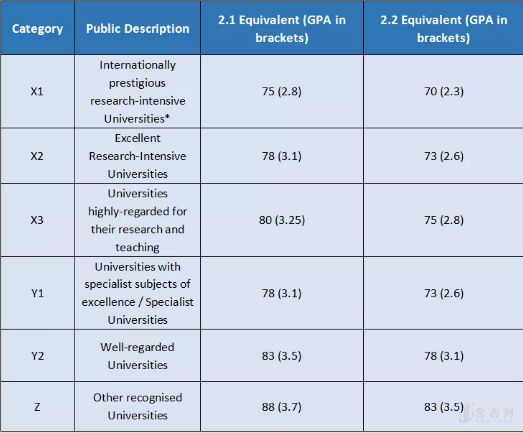 要求2:1学位的专业,针对Tier 1A/Tier 1B, Tier 2, Tier 3 的均分要求分别是75分、80分、85分,要求2:2学位的专业,针对Tier 1A/Tier 1B, Tier 2, Tier 3 的均分要求分别为70分、75分、80分。