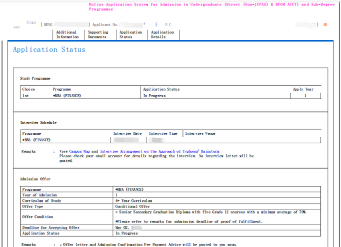 蒙同学于秋季递交在线申请之后于来年3月收到浸会大学本科和香港城市大学副学士的面试通知,通常情况下学校都会要求申请人亲自前往学校参加面试,特殊情况下可跟学校申请在线视频面试。面试形式一般是全英文,分为小组面试及个人单独面试,对于学生英文表述能力要求很高,且对于学校的专业信息、院校背景、行业认知、职业规划还有香港文化时政热点都会涉及覆盖到,所以学生在递交申请后必须及时安排好时间去做面试模拟和知识面的拓展,面试表现占到录取结果的半数甚至更多。