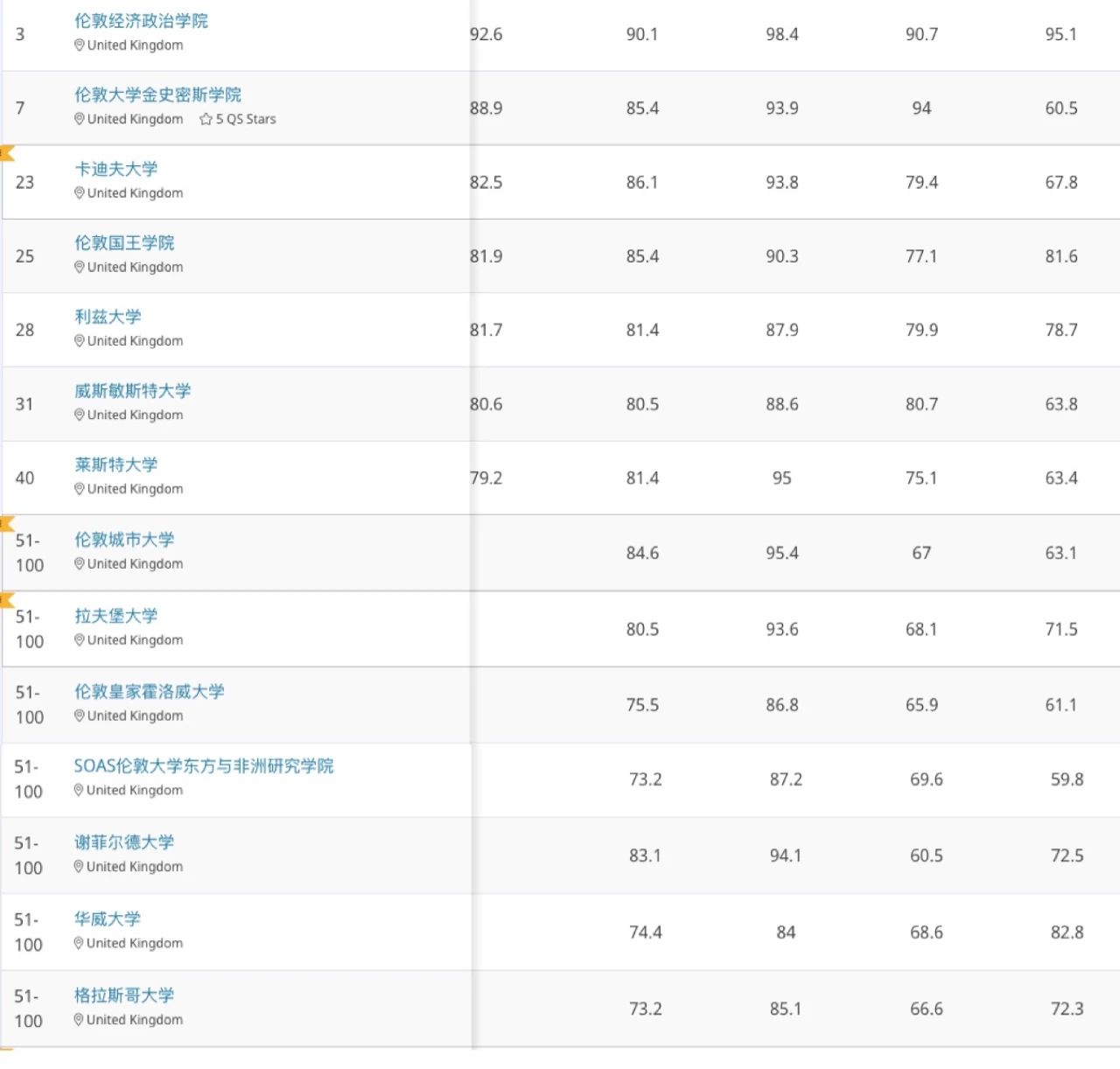 其中,以伦敦政治经济学院表现最为优异,位列英国第一、世界第三。伦敦大学金史密斯学院也在世界前十,位列第七。