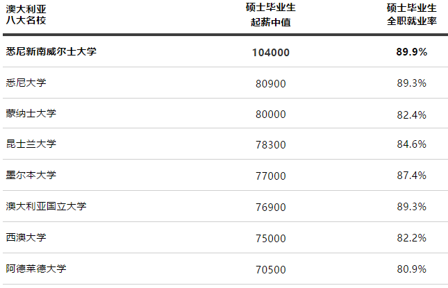 而最新的《2018毕业生就业情况调查(国家报告)》显示,新南威尔士大学硕士毕业生(授课型,下同)全职工作的 起薪中值 也全澳最高,达到10.4万澳元(相当于52万元人民币)。