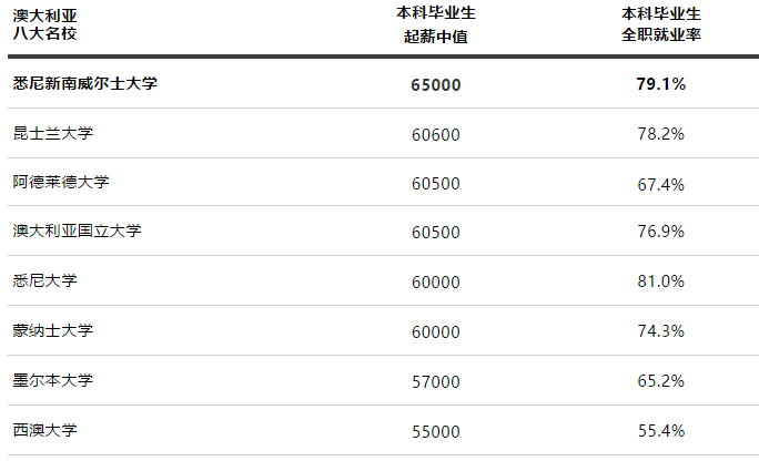 本科毕业生方面,我们也领跑“八大”,起薪中值为6.5万澳元(相当于32.5万元人民币)。