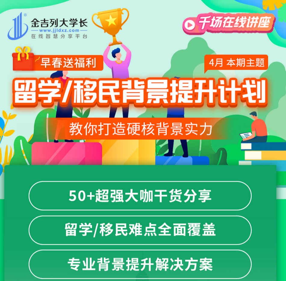 4月3日起,金吉列大学长【千场在线讲座】将以“留学/移民背景提升计划”为主题,全方位帮你打造硬核背景,突破申请局限,轻松收割名校offer!