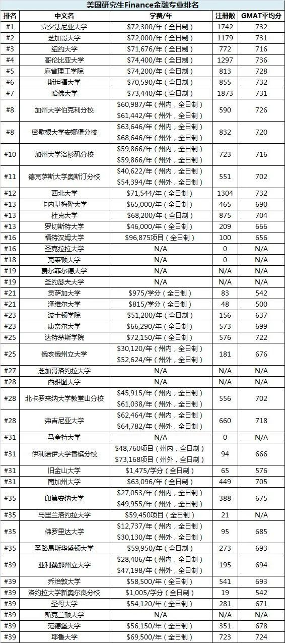 根据USNews发布的2020年美国大学研究生专业排名,金融专业TOP40的院校排名情况。