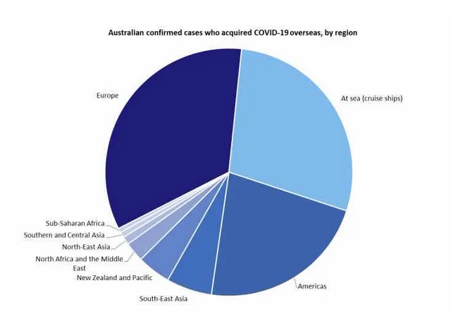以上图形显示了每个州和领地确诊病例的感染来源。目前为止,澳大利亚 65.7% 的确诊病例是在海外感染的。
