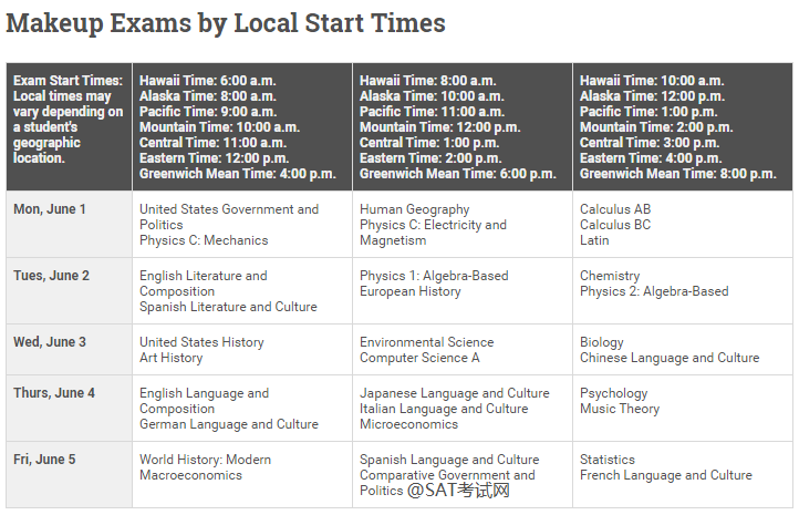 1、考试时间为5月11日至5月22日(美国时间);2、在全球范围内,每个科目的考试将在同一天,同一时间参加;3、补考时间是从6月1日至6月5日;4、学生可以在家中或学校参加考试。