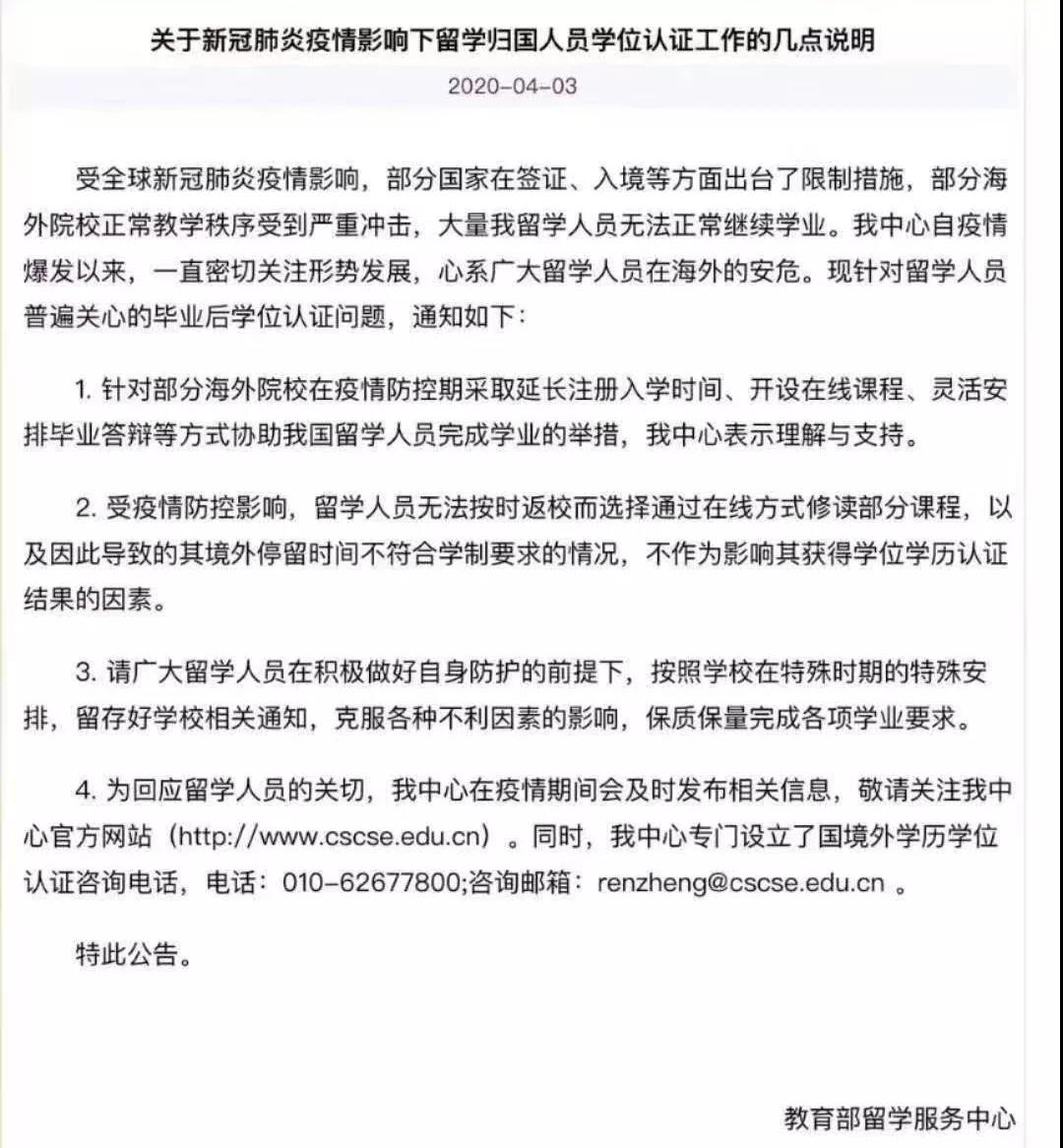 由于“疫情属于不可抗力因素”, 所以同学们的远程网课是不会影响回国的学历认证的!