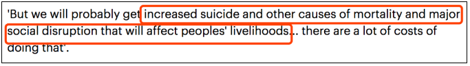 而且这种做法还可能会增加由自杀,以及严重的社会动荡造成的死亡人数,这样做的代价很大。