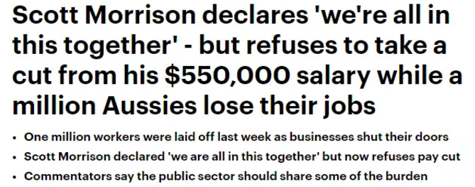 根据Dail Mail的报道,尽管现在有近100万澳人失业、Centrelink外排队领取救济金的人连绵不绝。但声称“我们将同舟共济”的澳洲总理莫里森,并没有考虑为自己减薪,来帮助澳人度过危机…