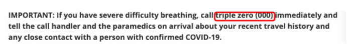 如果你有严重的呼吸困难,立即拨打triple zero(000),并且告诉呼叫中心的人员和护理人员你最近的旅行经历以及与已经确诊的covi19患者的任何密切接触!