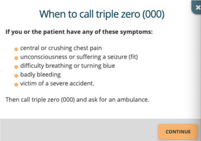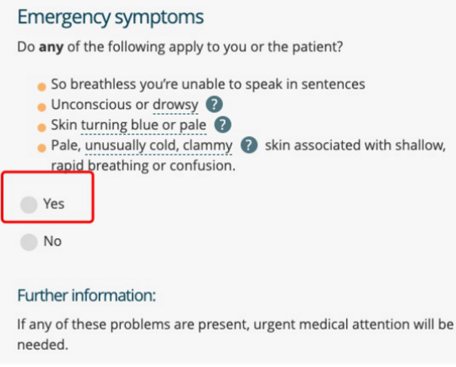 这一步会问你有没有一些非常紧急的症状, 一定要据实回答。非常重要!如果回答“Yes”,系统会生成获得救护车服务的号码。可以通过点击屏幕右下方的电话图标,输澳洲的手机号码,收取短信,执行下一步。