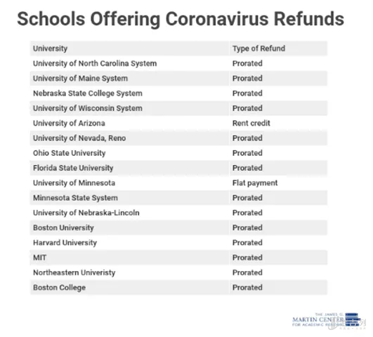 有一些大学表现地很积极, 就比如说北卡罗来纳大学系统,已经按照承诺退还了部分费用;还有缅因州大学,也做了同样的表率,总共退还了1280万美元的费用;俄亥俄州立大学、加州大学圣地亚哥分校都紧随其后;内布拉斯加州州立大学系统也表示将退还60%的费用。