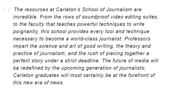 “卡尔顿大学新闻学院的资源令人难以置信。从一排排的隔音视频编辑套件,到传授强大技巧的大学教授,这所学校提供了成为世界级新闻工作者所需的一切工具和技术。教授们传授优秀写作的科学和艺术,新闻学的理论和实践,以及在严格的期限内将完美的故事拼凑在一起的热潮。卡尔顿大学的毕业生无疑将站在新闻时代的最前沿。”