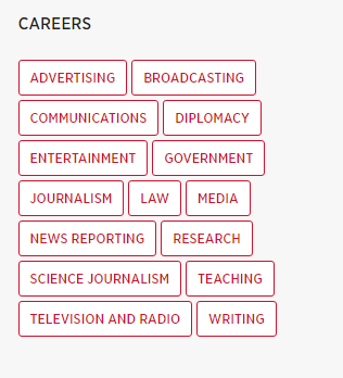 4) 多数专业不仅提供常规的教育还提供实习 co-op 课程,是近年来安排实习率最高的大学之一 ,毕业生就业面广,从事职业类型广泛(下图是卡尔顿大学新闻学院毕业的学生从事的工作,涉及工作领域包括广告、电视转播、新闻记者、律师、媒介、电影研究等)