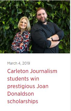 在一次全国性比赛之后,两名卡尔顿大学新闻学学生奥利维亚 · 罗宾逊( Olivia Robinson )和李维 · 加伯( Levi Garber )成为 2019 年琼 · 唐纳森奖学金的 获得者。唐纳森( Donalson )以加拿大广播公司( CBC )新闻网络的创始负责人的名字命名,是加拿大新闻界最负盛名的学生奖。仅授予八名。该奖学金在 CBC 组织内的一个或多个地点提供培训和为期四个月的带薪实习。