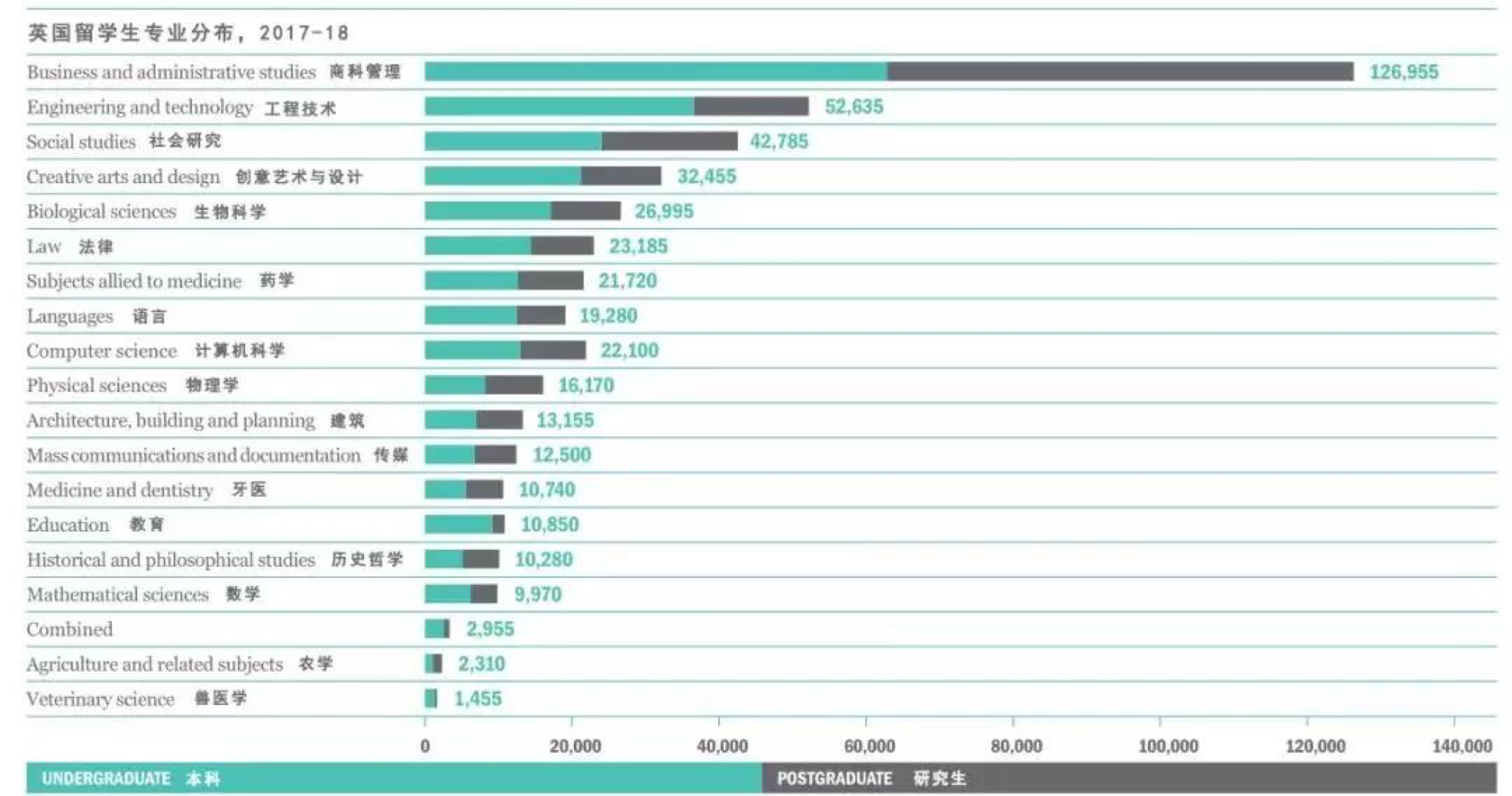 2017-2018 学年,国际学生选择最多的专业是商业和行政管理,其次是工程技术和社会研究类专业,留学英国的国际学生中 37.1% 选择商业和行政管理类课程, 31.9% 选择工程技术类专业。 教育社科类的专业近两年也变得非常热门。