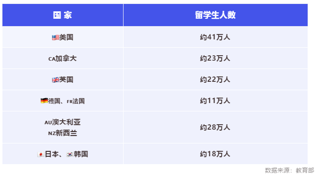 据教育部门统计,中国的海外留学人员总人数达160万人,目前尚在国外的约为142万人。中国留学生数量较多的国家分布如下: