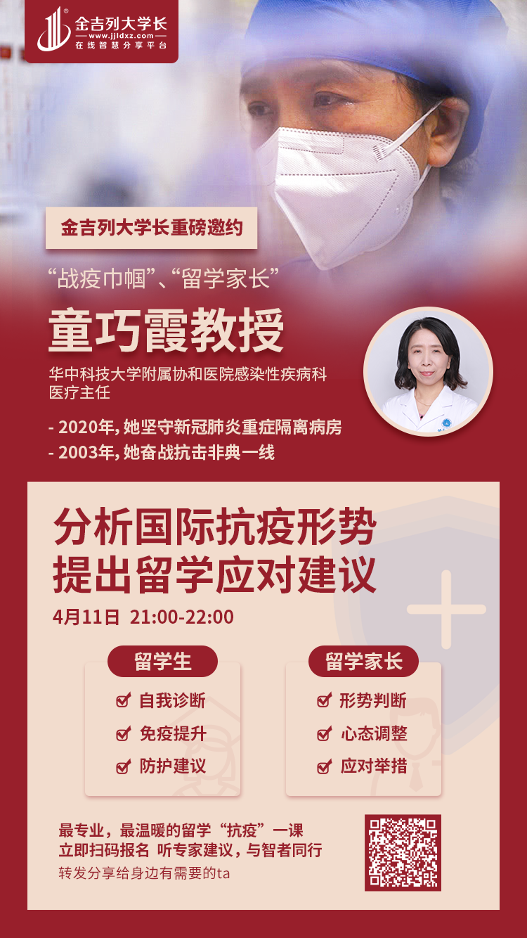 作为留学行业的旗舰机构,金吉列大学长努力为每一个留学生和家长提供有力帮助。 4月11日,金吉列大学长很荣幸地邀请到华中科技大学附属协和医院感染性疾病科医疗主任童巧霞教授 ,为所有学生和家长进行国外疫情形势解析和问题解答。