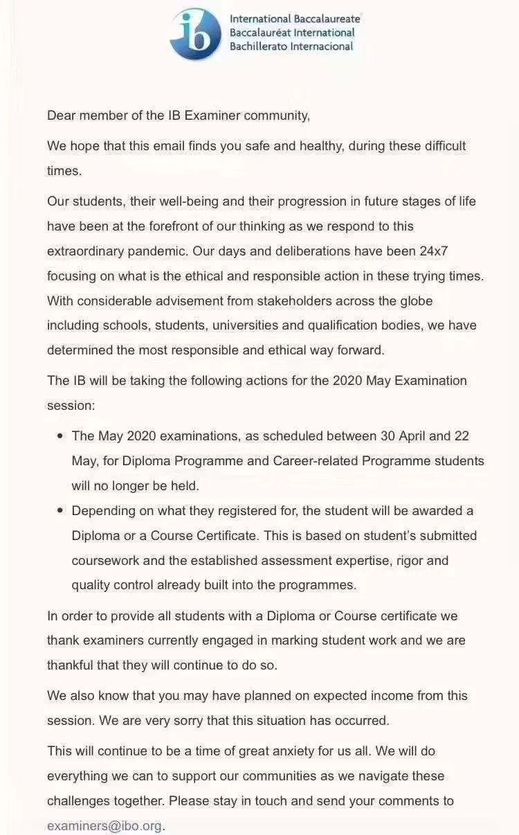 今年的IB考试虽然取消了,不过将改卷的权利下放给IB学校,学生的成绩会基于学生模考成绩来评定(最终评判标准待公布)。学生的最后学业总成绩会由之前已经提交的校内、校外考核,包括毕业论文,各个学科的小论文、哲学论文等,以及平时成绩,比如之前几个学期的总评、作业、出勤等分数来构成。