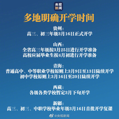 目前,全国已有多省市明确表示开学时间定在了3月下旬或4月初。