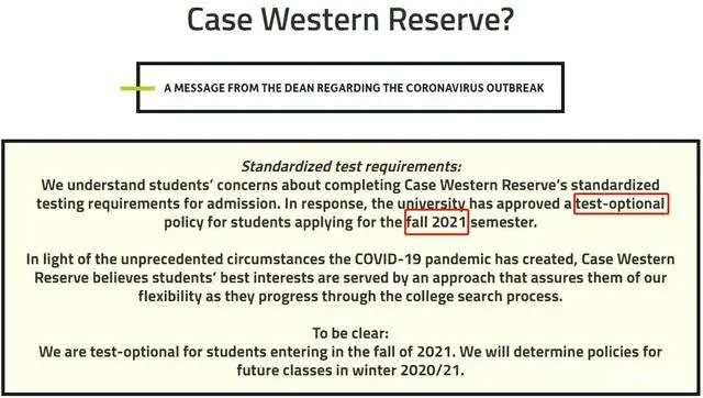 3月18日,凯斯西储大学正式公布:2021秋季申请者无需提供SAT/ACT成绩,采用“Test Optional”的政策接受申请。政策覆盖范围包括国际生。