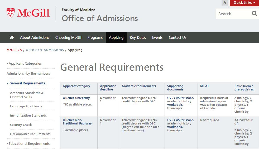 参考麦吉尔大学医学院的申请要求(不是录取要求):