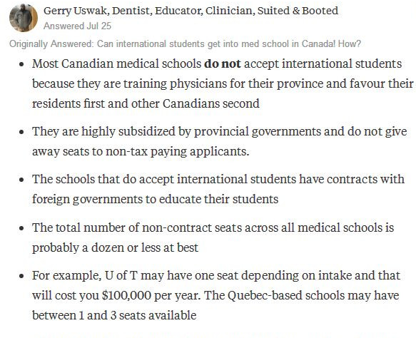 真实的情况:加拿大目前境内一共有17所医学院,先不说收不收国际生,不同省份的医学院对于本省的申请者都更有偏好。比如魁省的医学院录取的BC省的申请者比本地人多少了好多。