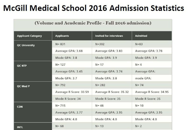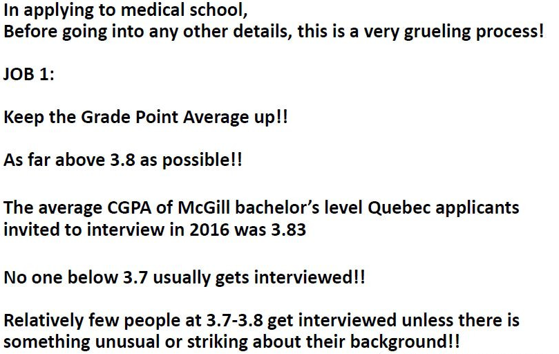 以上:最好本科GPA能有3.8,魁北克省申请医学院的人,拿到面试机会的平均GPA是3.83,GPA3.7以下不会得到面试机会。3.7-3.8之间的,除非你特别特别优秀,否则也是没戏。