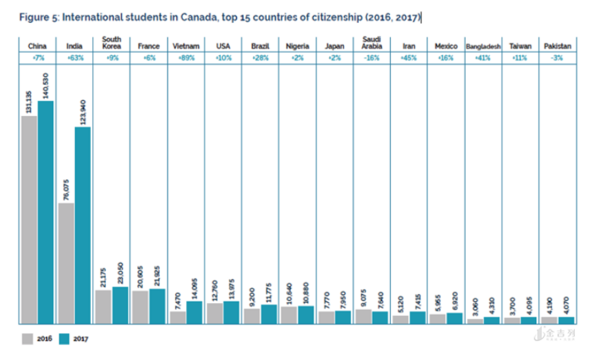 据加拿大国际教育局发布的《International Stuents in Canaa 2018》,在加拿大国际留学生来源地排名中,中国位居榜首,占比28%。2017年有140,530个中国留学生在加拿大注册留学,比16年同比上升7%。