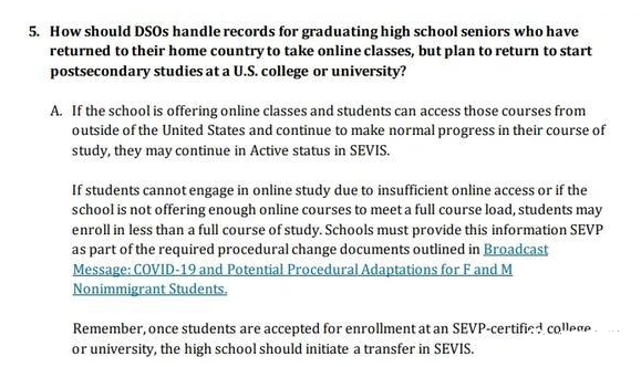 如果学校提供在线课程,并且学生可以从美国境外访问这些课程并在学习过程中取得正常的进展,则他们可以继续在SEVIS中处于有效状态。