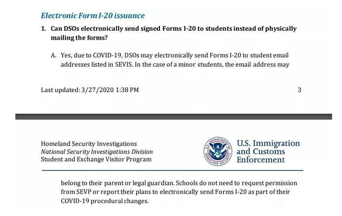 在COVID-19期间,DSO可以通过电子邮件的方式将I-20文件发送到SEVIS中显示的学生的电子邮箱里;对于未成年的学生,可能会发送到其父母或法定监护人的邮箱里。