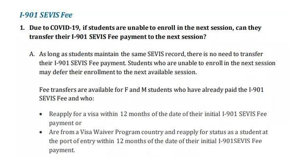 只要学生保持相同的SEVIS记录,则无需转移I-901费用。并且,因特殊情况无法注册的学生可以推迟到下一次开学。