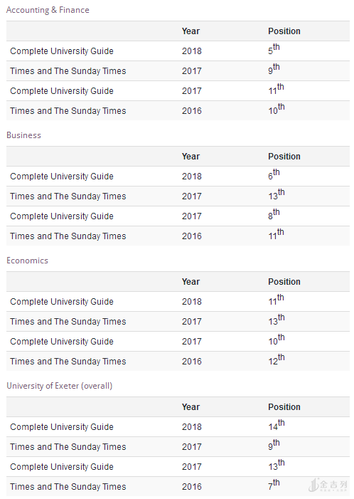 埃克塞特大学商学院在全英国大学排名中位居前列。这些排名通过多方面的评估来对各个高校及其专业领域进行排名,评估方面主要包括入学要求,科研评价,学生/员工比例、退学率、学生满意度、学生的学历等级和毕业生的就业情况。如下图所示