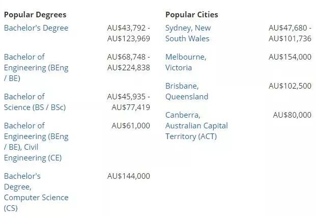 男生:AU$51,521 - AU$107,500; 最热门的专业&城市: