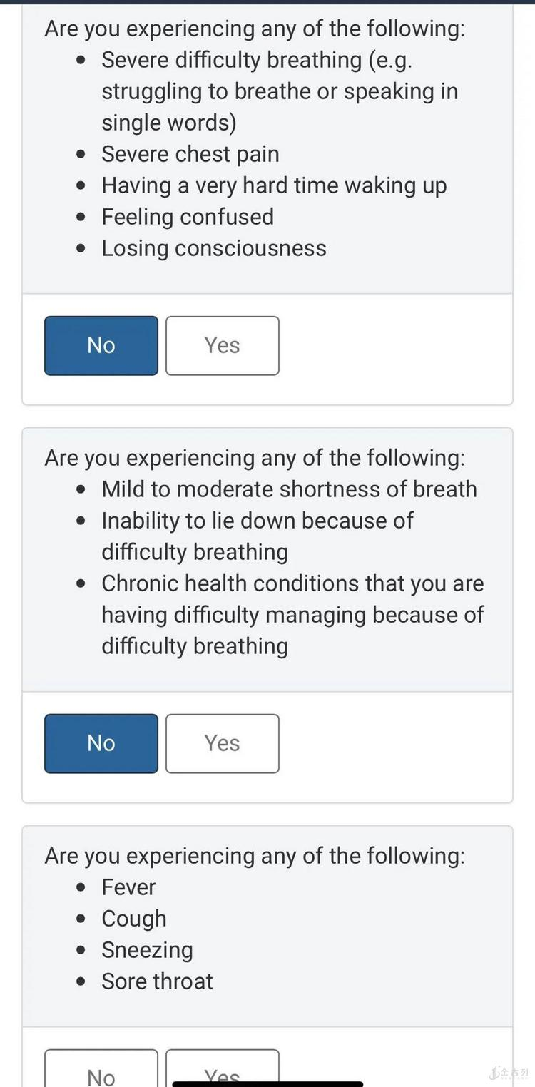 如果在第一个问题就填yes 的话, 那情况很严重,有感染风险, 页面直接跳到: