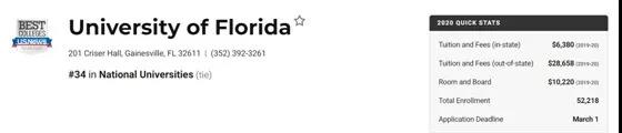在2020年U.S.News的学校排行榜中,佛罗里达大学全美综排第34位,在公立大学中排名第7。其中,新闻传播、工程、法律等领域颇有威望。同时,UF也是科研的领先者,与斯里普投资基金、博汉姆医学研究中心和墨菲特癌症理疗中心都有长期合作。