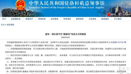 - 洛杉矶领事馆在领区向留学人员发放“健康包”等防护用品;