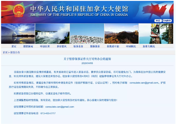为确保在加中国公民的健康安全,如无特殊紧急情况,建议大家推迟来馆办证。 驻加拿大使馆将自4月9日(周四)起暂停领事证件大厅对外办公。