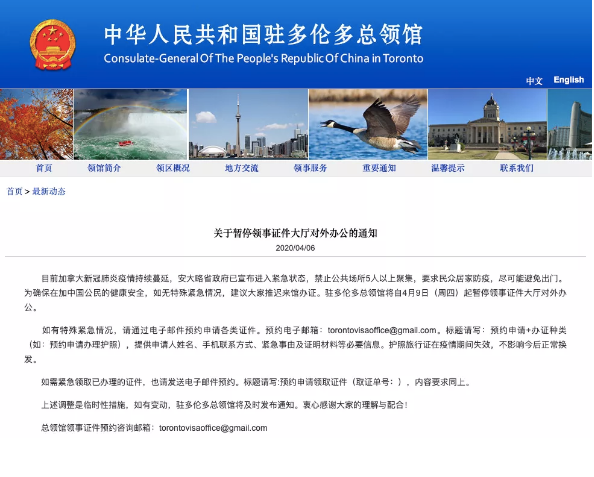 为确保在加中国公民的健康安全,如无特殊紧急情况,建议大家推迟来馆办证。驻多伦多总领馆将自4月9日(周四)起暂停领事证件大厅对外办公。