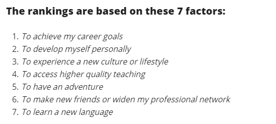 这份排名是根据7项因素对30,000多名国际留学生进行调查,最后综合打分得出。