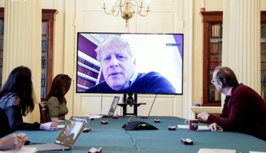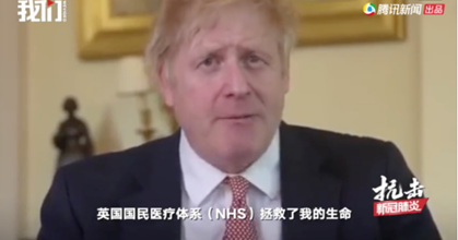 2020 年 4 月 12 日,英国首相府发言人称,首相约翰逊已经出院,将持续休养,暂不恢复工作。出院不久后,约翰逊通过社交媒体表示, “ 我很难用语言表达我对国家医疗服务 (NHS) 医务人员的感激之情,他们挽救了我的生命。 ”