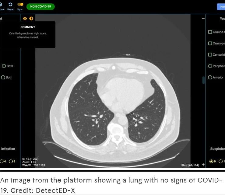 CovED是一个全网开放且免费的平台,得到了全球医疗专家和领先企业的支持。借助CovED,临床医生可以通过真实的CT图像进行虚拟诊断并得到即时的反馈,查看虚拟诊断中产生的所有错误。系统还会按照业界标准为其打分,以此帮助使用者评估自身表现。随着时间的推移,诊断难度也会相应增加。