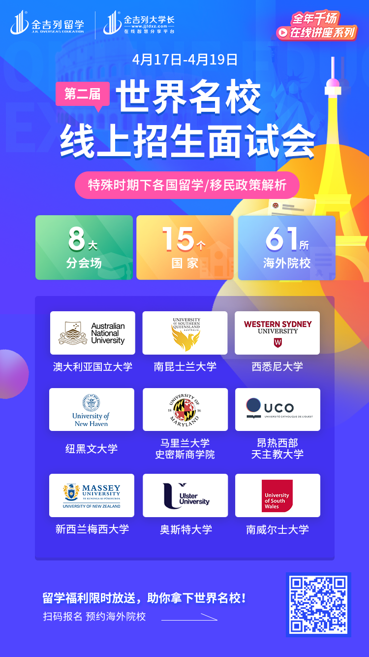 为让广大准留学生们更清楚地了解到国外院校及其最新招生动态,金吉列大学长邀请了美国、英国、加拿大、澳洲、新西兰、俄罗斯、白俄罗斯等15个国家,61所海外院校共同参与本次线上招生面试会。