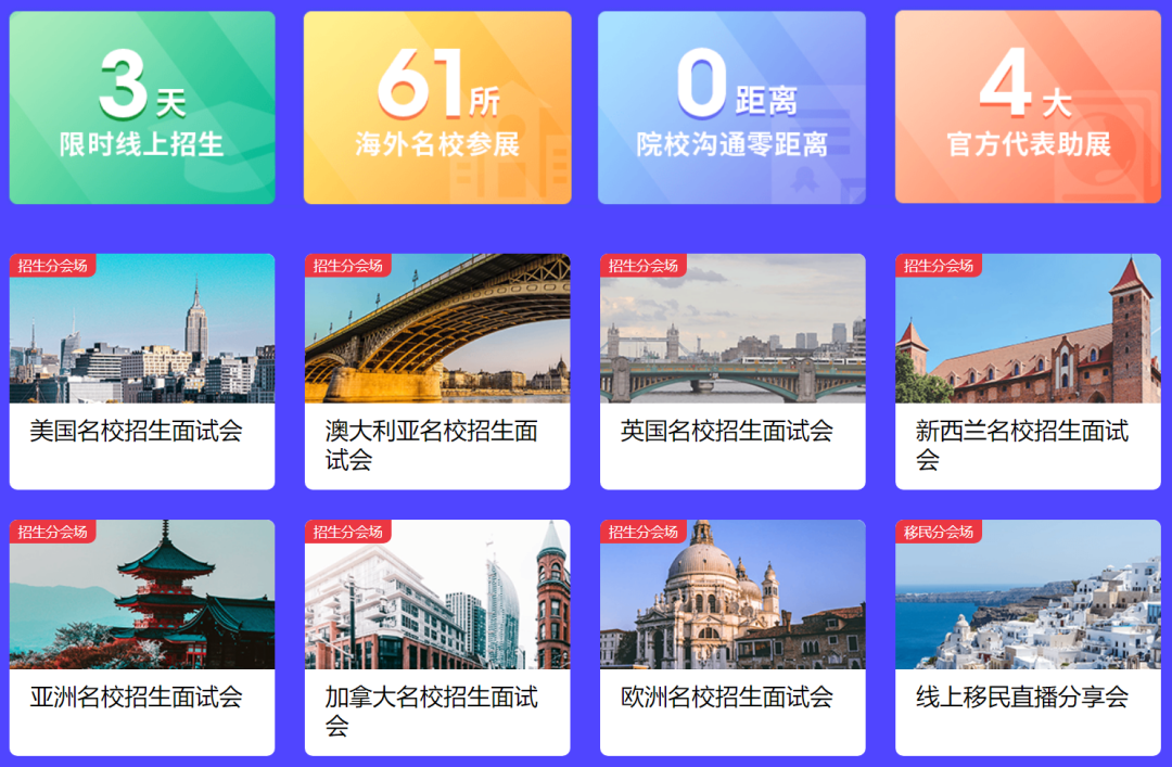 面试会将为学生们呈现与名校“零距离”的交流体验,现场招生、面试评估、全方位解读各自学校招生政策,揭秘留学申请和录取的关键 因素……让众多学子不出家门即可近距离约见全球院校招生官。