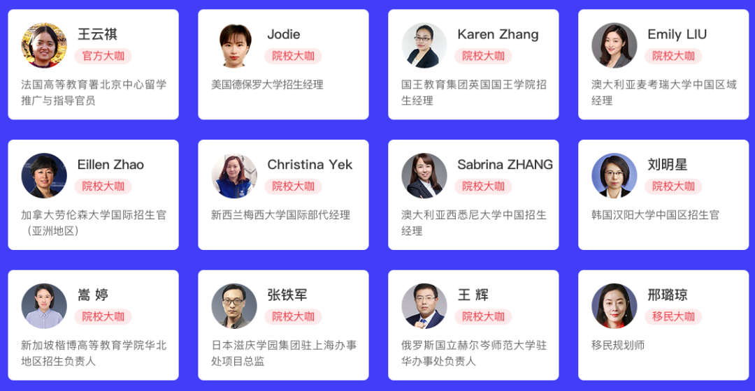 来自美国、英国、澳洲、加拿大、新西兰以及亚洲、欧洲等15个国家,数十所优质名校招生面试官在线一对一进行测评、面试和评估,为你答疑解惑。 只要你足够优秀,就能现场拿下名校OFFER,直接成为名校的一员!