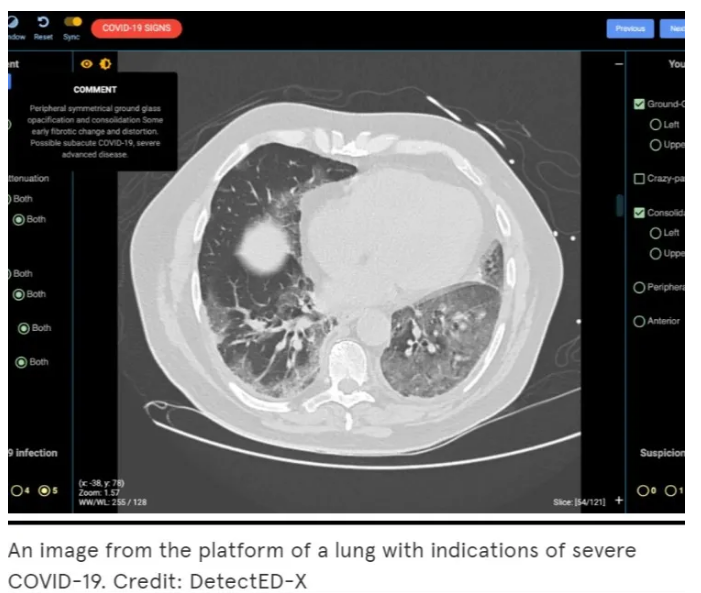 尽早诊断新型冠状肺炎对早期治疗和隔离至关重要。目前,肺部CT已被证明是诊断新型冠状肺炎的首要工具,但医生的CT读片技能可能需要长年累月的经验积累。由DetectED-X开发的名为CovED的辅助测试工具将帮助现有的医生及相关工作人员更快、更准确地诊断病例,并为更多有需要的人员及机构提供快速培训,从而获得完备的CT读片技能,其定制化的培训模块只需要1-2小时就可以生成。