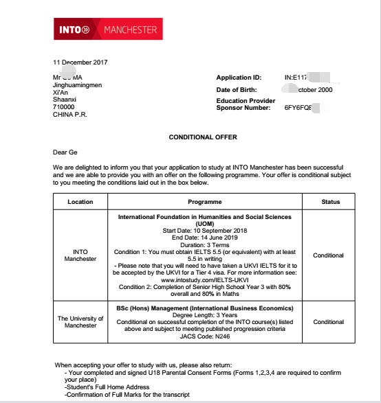 学生咨询的时间比较早,在高二上学期就开始了解留学,就是希望能够尽早地以非常充分的准备状态递交英国名校申请。因此在得知英国是可以在高二结束之后就可以出去读书的时候,异常欣喜,因此很快就签署了留学协议。 结合学生的学习背景及其性格, 老师在申请文书中着重强调学生的性格优势及学习能力;以最快的时间查出来适合学生的学校,向学生讲解了学校环境,专业优势及升学率。 学生也对于自己可以申请到全球排名前 30 和前 40 的曼彻斯特大学和布里斯托大学的商科专业感到非常满意!