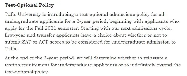 塔夫茨大学将为所有本科申请人开启为期三年的test optional政策,从2021年的秋季开始实行(国际生相同)。也就是说,从新一个录取周期开始,申请人可以自己选择是否提交SAT/ACT成绩。在3年期结束后,校方再决定是否继续实行test optional。
