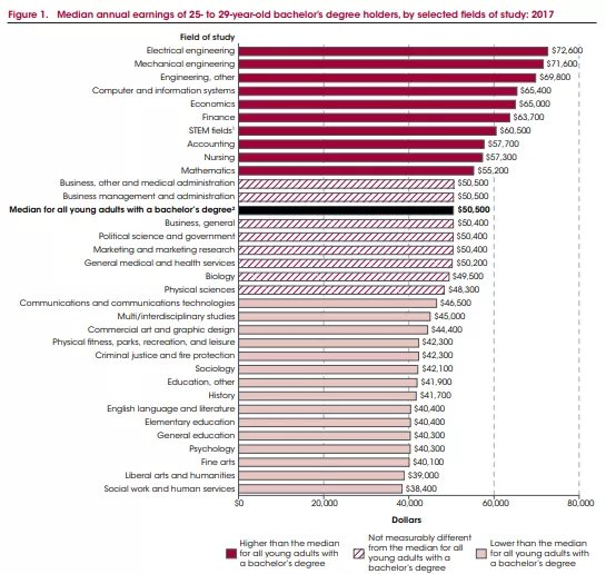 而在 National Center for Eucation Statistics 公布的 2017 年美国 25-29 岁本科毕业生年薪中位数排名中,电子工程、机械工程、其他工程、计算机与信息系统、经济、金融、STEM 类、会计、护理、数学专业年薪高于全行业平均值。“理工类专业最赚钱” 的说法,得到了实锤认证。